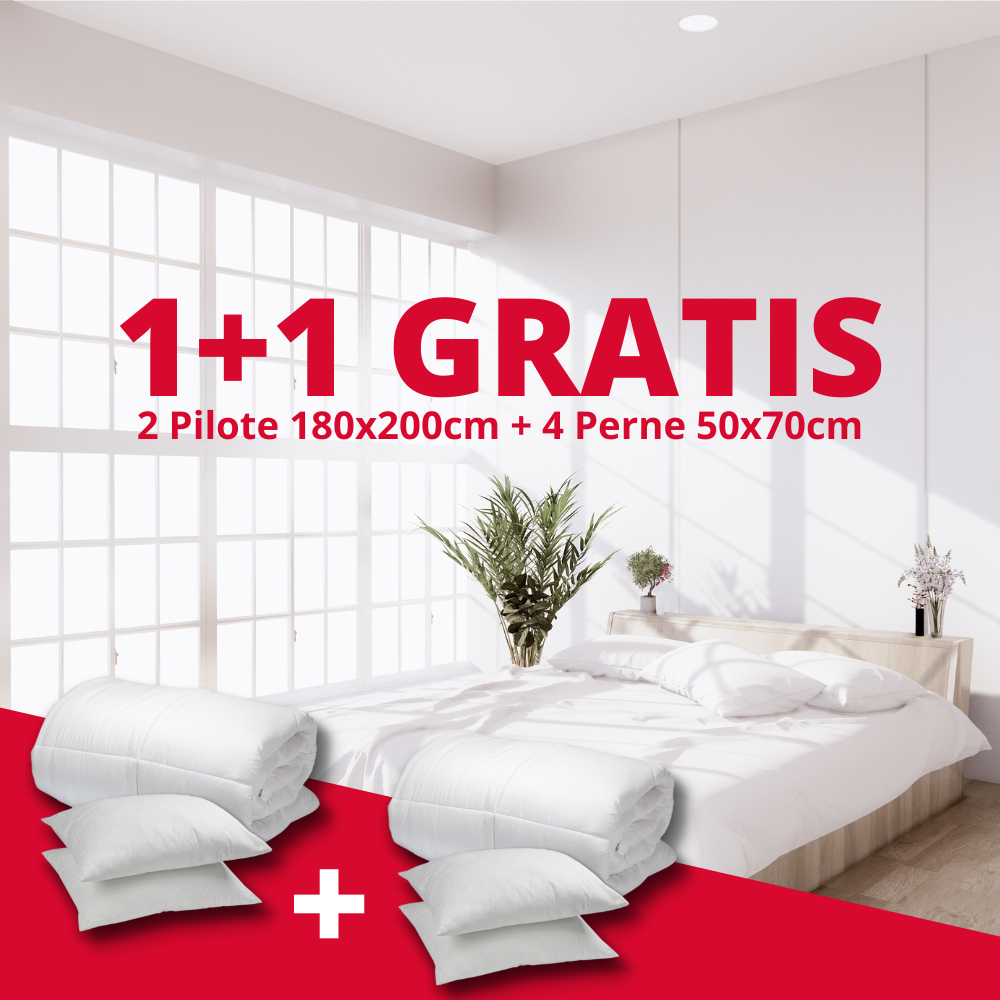 Setul contine 2 Pilote de 180x220 cm + 4 Perne Hypo-Alergice 50×70cm, ideale pentru un somn odihnitor. Pilota este umplută cu vatelină (250g/mp), iar fața este făcută din microfibră albă catifelată. Pernele sunt umplute cu fibre siliconice, iar fața este făcută din microfibră embosată catifelată.